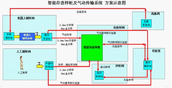 智能氣動存取樣系統(tǒng)分為智能存查樣柜子系統(tǒng)和氣動管道傳輸子系統(tǒng)兩大部分,統(tǒng)一在煤樣存儲系統(tǒng)管理軟件(中央管理機)調度下協(xié)調工作,實現用戶全自動存樣、半自動存樣、全自動取樣、半自動棄樣等多種功能需求,并統(tǒng)一由客戶燃料管控系統(tǒng)聯(lián)網管理。氣動管道傳輸系統(tǒng)由中央管理機、全自動工作站、半自動工作站、風機動力單元、轉換器、旁通管及傳輸管道組成,智能存查樣柜系統(tǒng)由可靈活擴展的智能存查樣柜組成。通過傳輸管道將相距數百米的存樣間、自動制樣間、人工制樣間、棄樣間和化驗室各設備聯(lián)接在一起,通過風機動力的吸氣和吹氣,使管道內形成正負空氣壓力差,在中央管理系統(tǒng)的控制下,實現煤樣瓶在各點的往返運動。從而實現煤樣在多點的全自動存樣、取樣和棄樣。